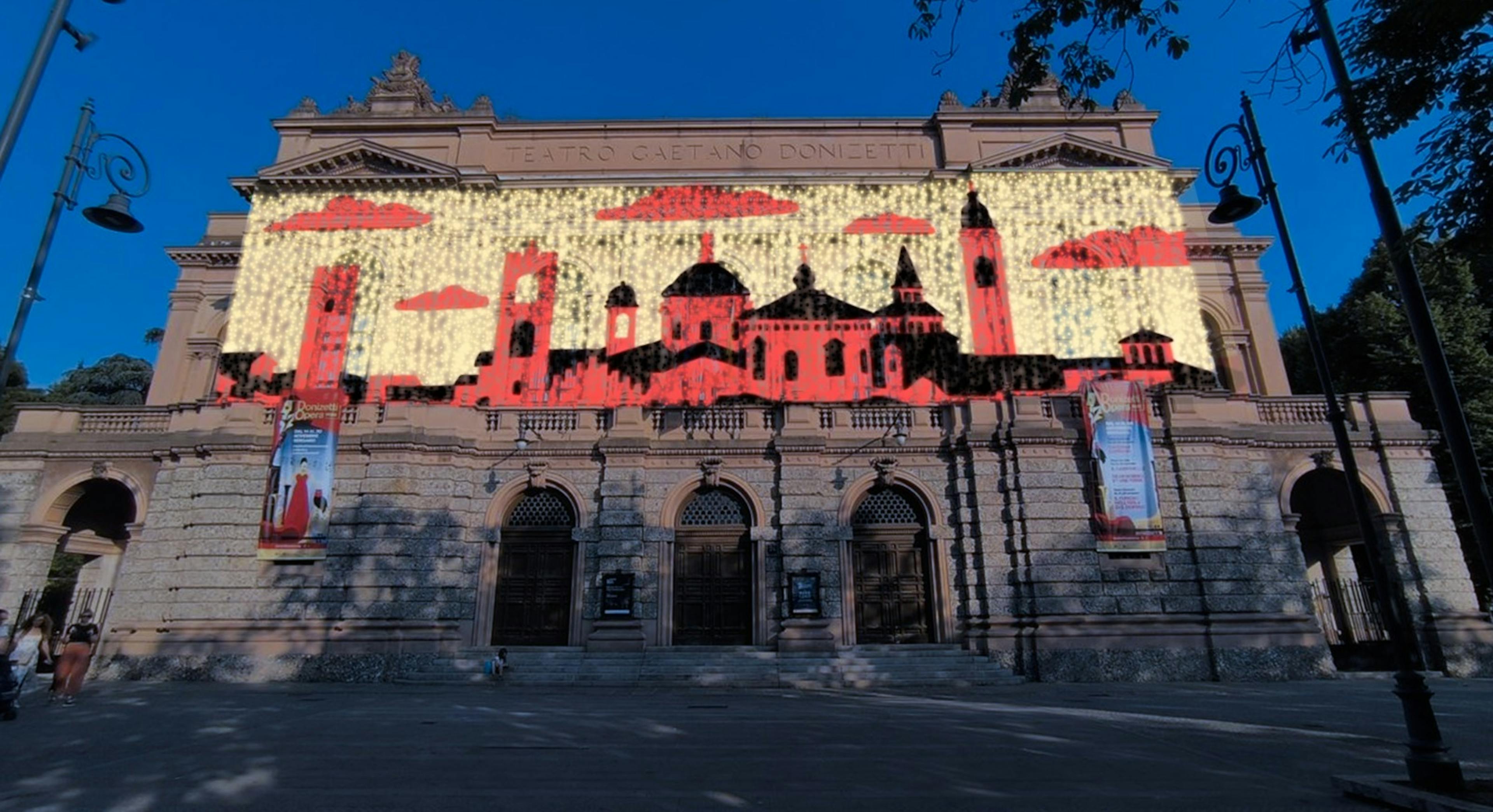 Con questo intervento di illuminazione artistica ad alto tasso di spettacolarità, il sipario si alza già a partire dalla facciata del Teatro Gaetano Donizetti, che prende vita grazie a una cascata di microled che rendono dinamici i disegni di Pier Luigi Longo. Brevi clip animate, a cura di Cieli Vibranti e Scena Urbana, raccontano il teatro, la sua storia e i suoi protagonisti, in un viaggio tra musica, poesia e divertimento che porta la magia dell'opera al di fuori del suo tempio d'elezione, rendendola fruibile a tutti. Perché tutti oggi abbiamo un impellente bisogno di sogni e un improrogabile dovere di continuare a sognare. Proprio dalla facciata del Donizetti, punto di riferimento per la comunità bergamasca e per il mondo dell'opera, della prosa e del balletto attraverso i secoli, ogni animazione consentirà di esplorare il “pianeta teatro” da una diversa prospettiva, scoprendone luoghi, protagonisti, magia e storia attraverso un linguaggio pop. L’opera nasce dalla collaborazione di......