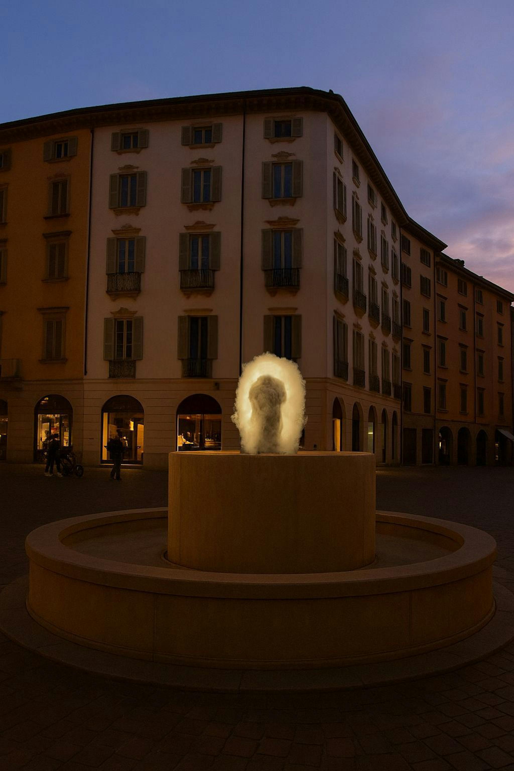 Al centro della celebre fontana di Largo Rezzara, una figura in bronzo alta un metro è completamente avvolta da una nuvola evanescente, sospesa tra presenza e dissoluzione. La materia è lì, ma velata. L’immagine esiste, ma è irraggiungibile, in un involucro simile a una massa di ovatta, priva di contorni geometrici definiti, quasi fumosa. Questo "guscio" lattiginoso diventa metafora del ricordo annebbiato del sogno, di quel tempo intermedio in cui la mente cerca di trattenere ciò che sta dimenticando. La figura non si mostra: si intuisce grazie alla luce a led che emana l'installazione, come accade con certi sogni che, al mattino, sembrano ancora presenti eppure sfuggono, perdono nitidezza. Con il passare dei giorni, la pioggia e l’umidità invernale iniziano a sciogliere lentamente l’ovatta, lasciando che la figura emerga, forse in parte, forse del tutto. La materia sottile e fragile dell’involucro, infatti, reagisce agli agenti atmosferici: pioggia, vento e tempo contribuiscono a tras......