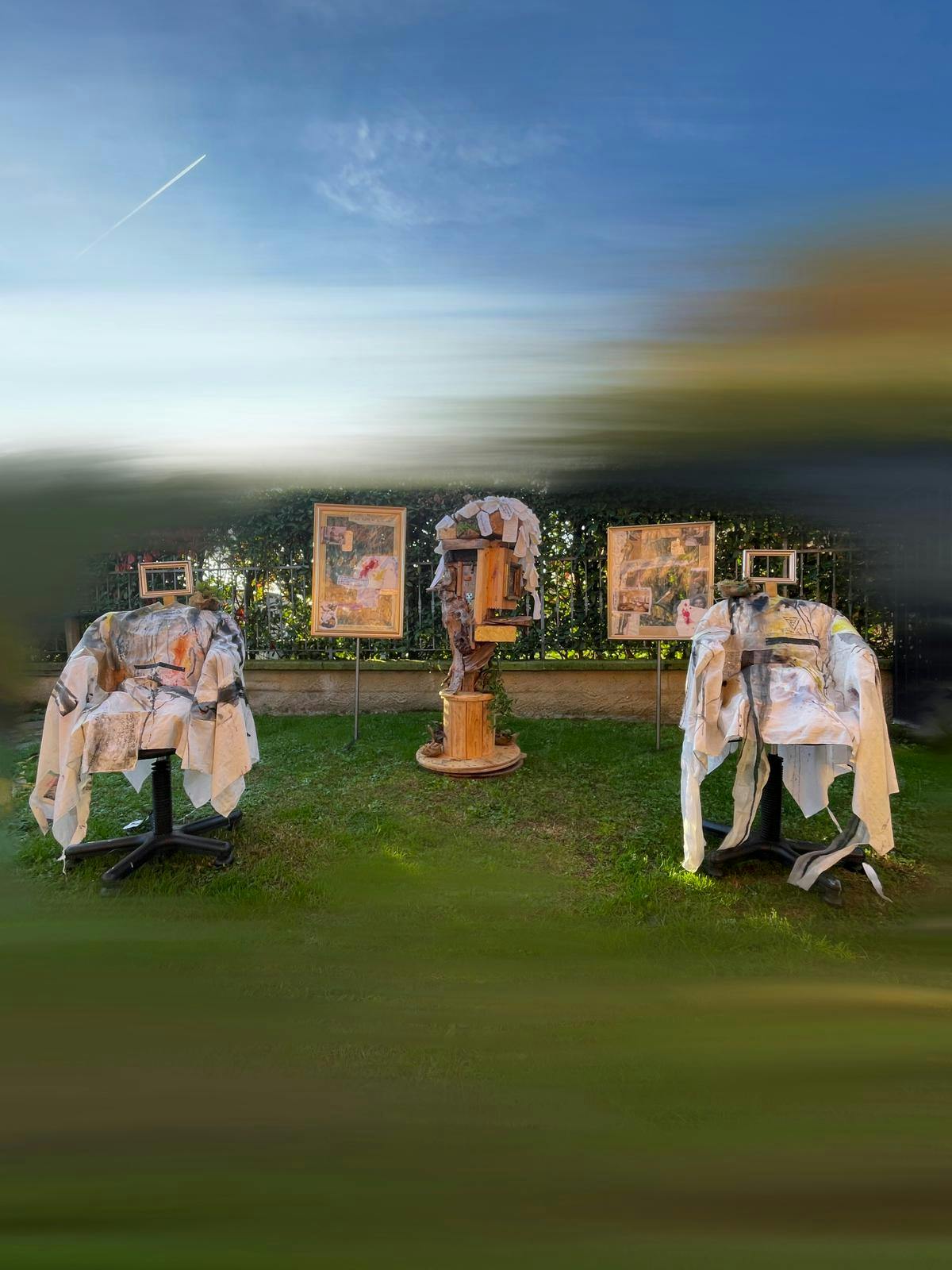 Specchi e Radici è un’installazione partecipativa che trasforma lo spazio urbano in un palcoscenico simbolico dove il prendersi cura si manifesta come esperienza condivisa. L’opera si compone di poltrone da salone di bellezza su cui sono fissate mantelle artistiche: superfici che qui non servono alla funzione originaria, ma diventano tele collettive. Al centro, una grande testa tridimensionale in legno di recupero (naturale e lavorato) accoglie contributi e pensieri che si stratificano, costruendo un racconto collettivo. Gli specchi, a loro volta, non sono superfici riflettenti, ma supporti poetici che restituiscono frasi e immagini dedicate alla memoria, alla radice e all’identità. L’intero spazio diventa un luogo di condivisione, in cui la partecipazione è atto creativo e la cura diventa linguaggio comune. Il pubblico è invitato a scrivere, dipingere, cucire lasciando segni che raccontano emozioni, condividere un pensiero o una memoria. Gli specchi non riflettono l’immagine reale......
